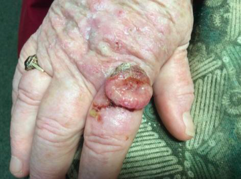 • Most commonly affected areas are back of hands, forearms, scalp, lower lip, pinna