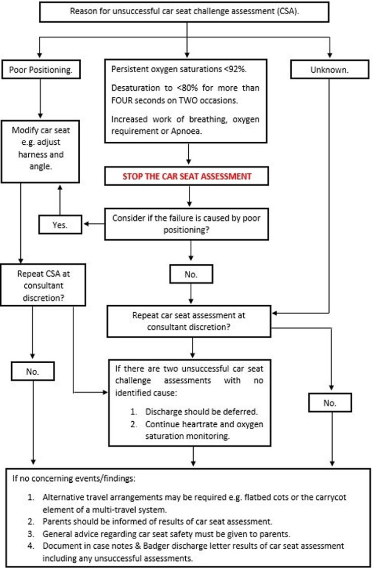 • If there are two or more unsuccessful car seat assessments, then individual assessment of the baby (at consultant discretion) should be undertaken to assess their safety for discharge.