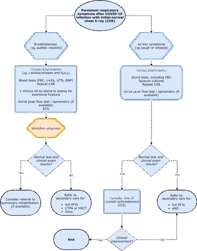 Offer chest X-ray by 12 weeks after acute COVID-19 if the person has not already had one and they have continuing respiratory symptoms. Chest X-ray appearances alone should not determine the need for referral for further care. Be aware that a plain chest X-ray may not be sufficient to rule out lung disease.