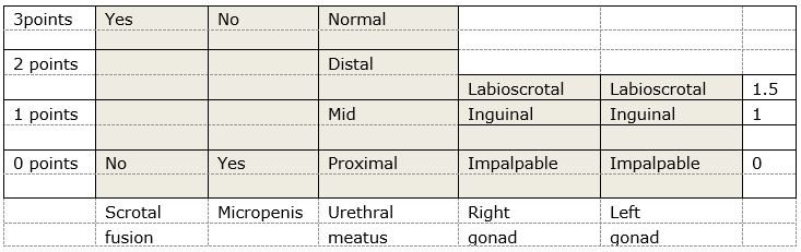 • There are various scoring systems available to assess the external genitalia. We recommend the use of the External Masculinising Score initially, shown below. This is useful to tell the Endocrine team when referring the patient.