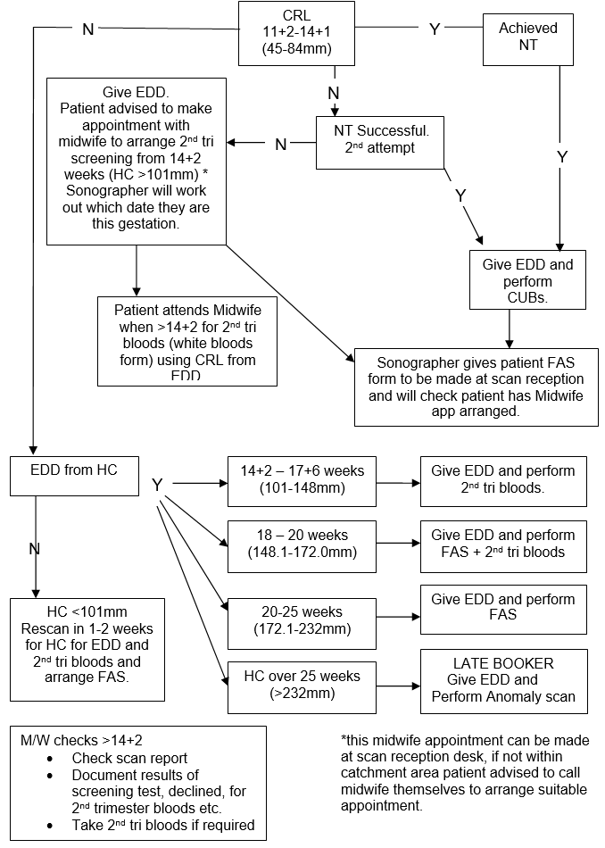 If the initial scan is performed < 11+2 weeks gestation, the patient should have a return appointment at approximately 12-13 weeks gestation to perform optimal dating +/- NT measurements.