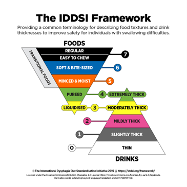 • yellow dysphagia menu for modified diets (see International Dysphagia Diet Standardisation Initiative (IDDSI) Framework below), (IDDSI -Complete Framework iddsi.org)