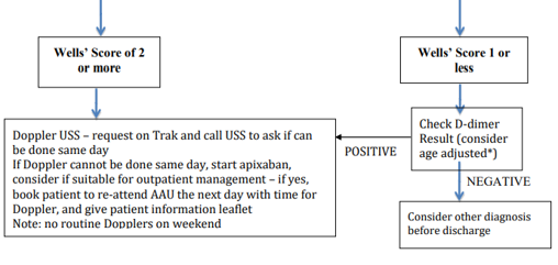 If D-Dimer positive without any other possible cause: Discharge home, and review in 1 week for possible repeat Doppler ultrasound. Decide on interim anticoagulation case by case. If D-Dimer result negative: DVT unlikely, consider alternative diagnosis and discharge. |