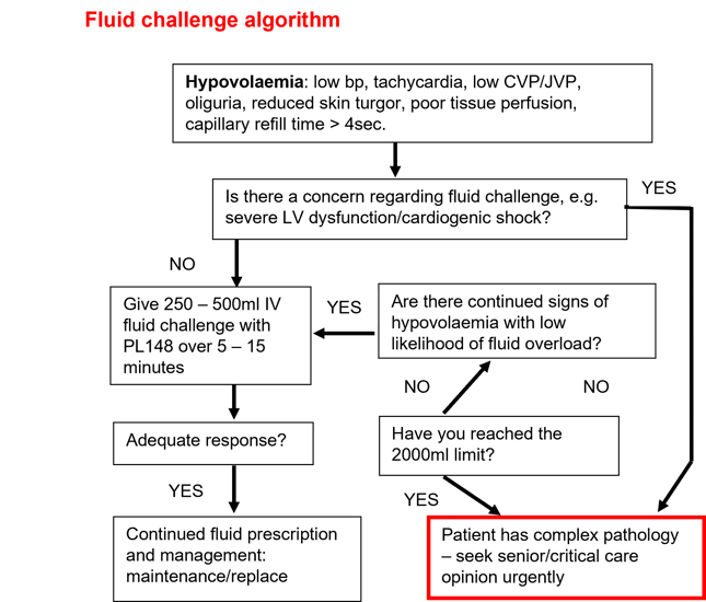 For frail, elderly patients with renal impairment or cardiac failure and patients who are malnourished or at risk of re-feeding syndrome, consider giving less fluid: 20-25ml/kg/day (NICE guidelines). Consult a senior doctor for fluid advice. Give Pabrinex IV if at risk of re-feeding syndrome.