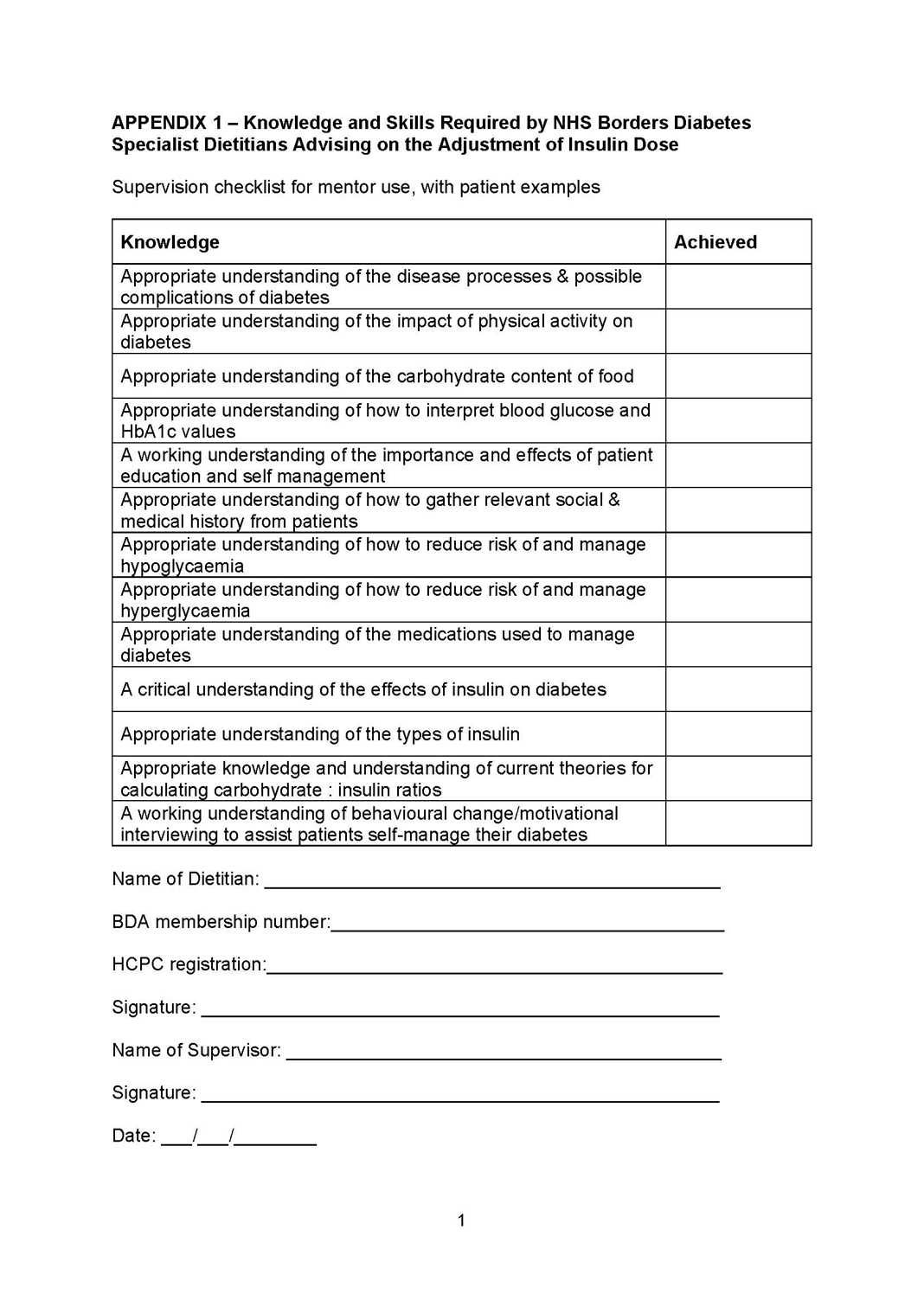 Appendix 1 - Knowledge and Skills Required by NHS Borders Diabetes Specialist Dietitians Advising on the Adjustment of Insulin Dose