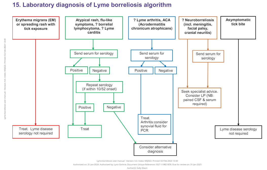 All serology requests must include: symptoms, time between tick bite / possible exposure and onset of illness. Samples with inadequate clinical details (e.g. ?lyme, tick bite) will not be referred for testing.