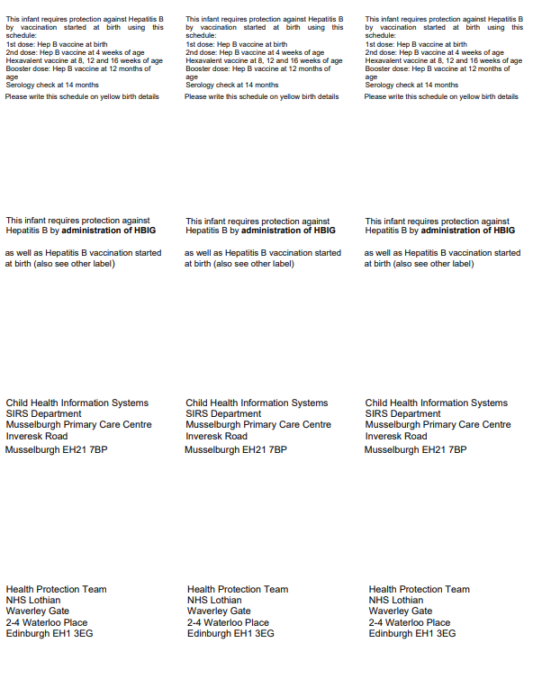 3. Record information on 1st hepatitis B vaccine dose (and HBIG where indicated) on postnatal notification form and send or email to Child Health Information Systems (SIRS) CHIS.EastMidlothian@nhslothian.scot.nhs. And Health Protection Team (Public Health) health.protection@nhslothian.scot.nhs.uk at email addresses given on form, or using labels. This is very important as once SIRS/HPT receive information on first dose they will notify GP and parent/carer when subsequent doses are due.