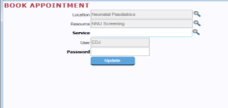 6. Clicking on the “Service” hyperlink for the appointment you just made (eg “Neonatal Jaundice Screen” “Neonatal Haematology” etc) will bring up the “Appointment Details” screen – in the “Notes” section you can add relevant information for your colleagues and finish by clicking “Update”
