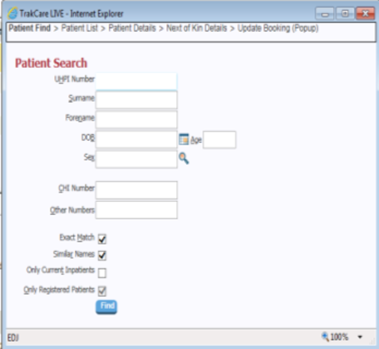 4. Enter the patient details (CHI/UHPI) , click “find” and confirm correct patient