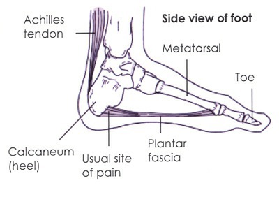 Plantar fasciitis causes pain normally under the heel when the plantar fascia becomes inflamed. The plantar fascia is a strong band of tissue, similar to a ligament. It stretches from the heel to the middle of the foot. It supports the arch of your foot and small injuries to it can cause inflammation and symptoms most likely near your heel.