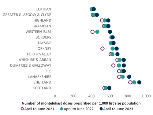 Number of montelukast doses prescribed per 1000 list size of population