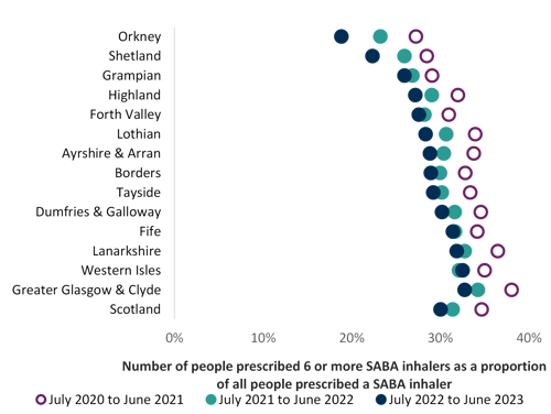 This guide includes an indicator chart of people prescribed three or more SABA inhalers as an aspirational level, as a person with well-controlled asthma would need no more than this (see Chart 2). This should be discussed at their annual routine review. This indicator is a guide and is unable to distinguish between people with asthma and COPD.