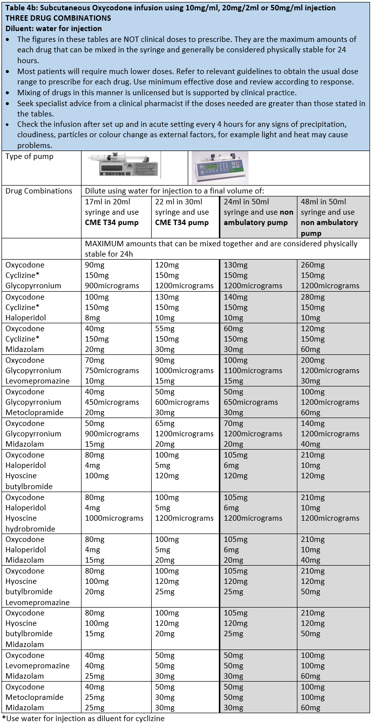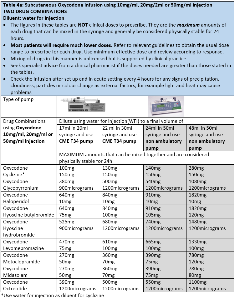 Subcutaneous Oxycodone Infusion using 10mg/ml, 20mg/2ml or 50mg/ml injection (2 Drug Combinations)