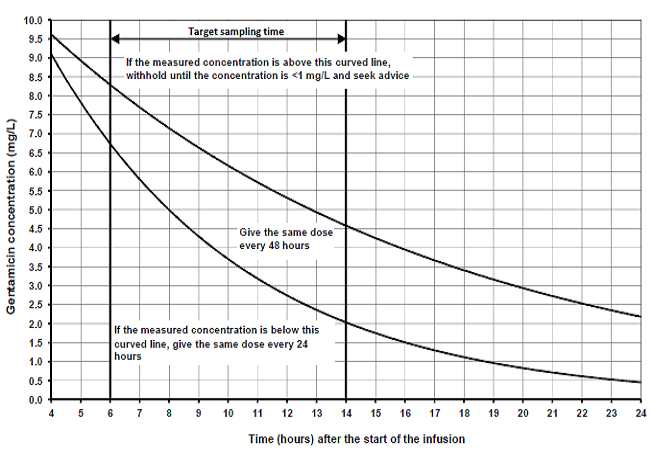 • If a blood sample is not taken, is lost or is taken at wrong time and if there is any concern about the patient’s renal function, take a sample 20 to 24 hours after the start of the gentamicin infusion and wait for the result before giving the next dose. Otherwise, take a blood sample after the next dose.