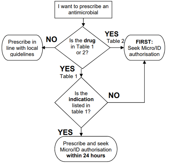 In the absence of a valid authorisation code, no antimicrobial will be supplied, and the ward pharmacist will contact the prescriber who is welcome to discuss with a consultant microbiologist.