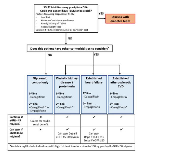 Some agents have licenses for specific indications. The following flow chart demonstrates some of the factors to consider when considering initiation of an SGLT2 inhibitor.