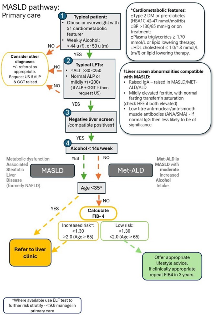 This national pathway is a pragmatic guideline that gives advice on primary care identification and management of MASLD, together with guidance for secondary care pathways and the interface between the two.