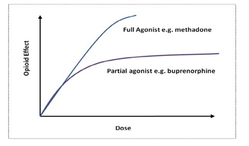 • only partially activates opioid receptors producing less euphoric or sedating effects than full opioid agonists such as heroin, morphine and methadone