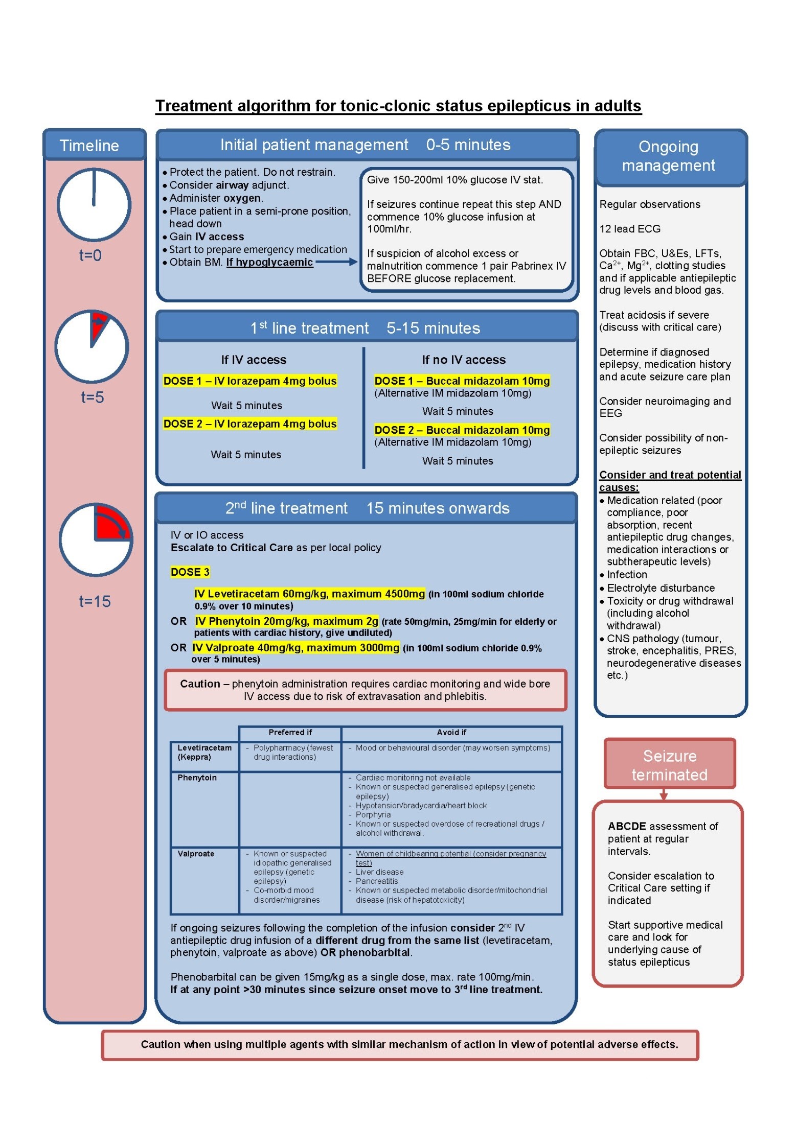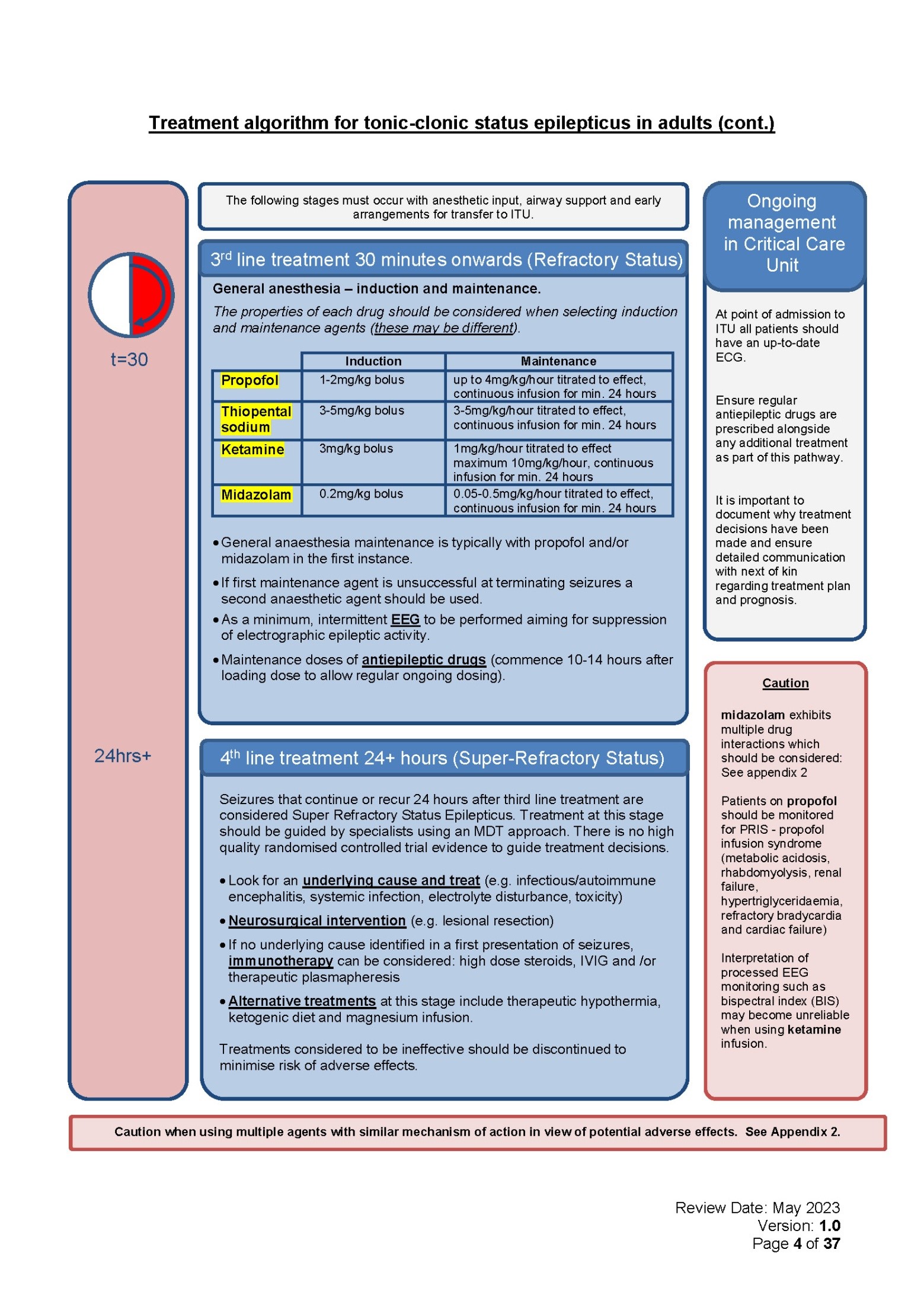 If seizures continue despite second line therapy, the patient is considered to have refractory status epilepticus. Mortality rates are high and as a result rapid initiation of IV anaesthetic agent should be commenced, titrated to suppress epileptic activity on EEG. Urgent EEG should be arranged.