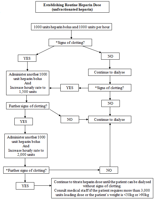 7. At the end of dialysis calculate the total amount of heparin administered and plan to administer this at the next dialysis session and monitor for signs of clotting. For example – if a total of 5,000 units has been given give a bolus of 1,500 units and an hourly pump set at 1,000 units. Remember to set stop time for 30 minutes before the end of dialysis if the patient has an AVF.