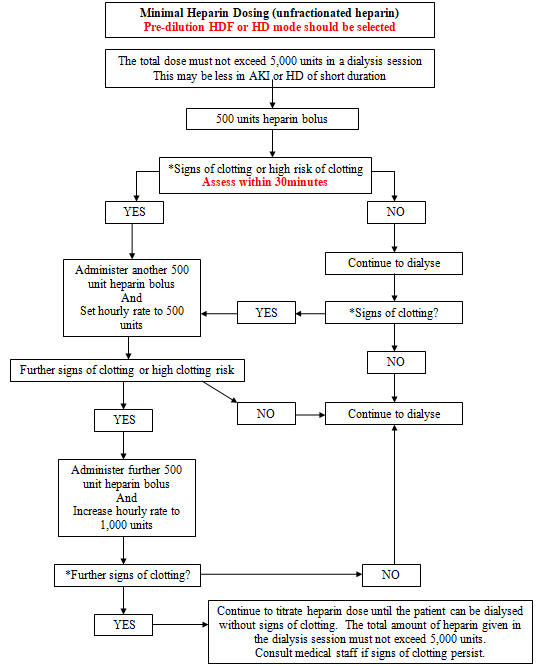In these situations dialysis should be performed without any heparin, or according to the unfractionated heparin protocol, and each case will require individual assessment by renal unit medical staff.