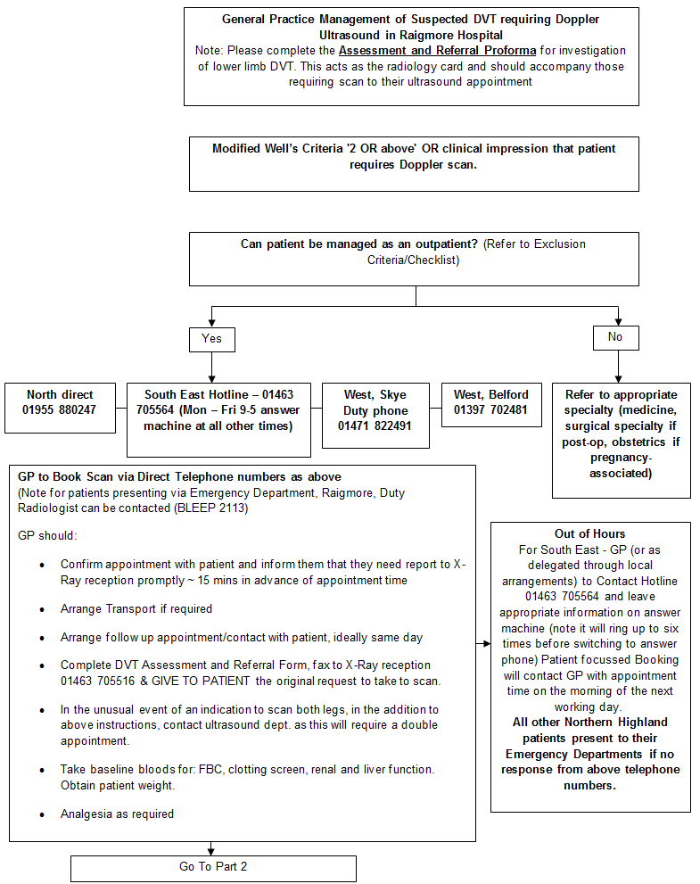 Patients who are considered on clinical grounds as being at moderate or high risk of DVT (Wells’ score -2) and who are not getting ultrasound and follow up the same day should be treated with rivaroxaban pending confirmation of diagnosis.