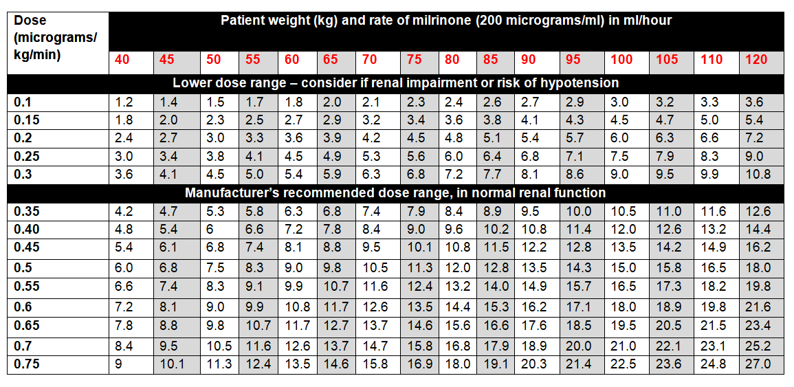 - Licensed dose: 0.375 to 0.75 micrograms/kg/minute in normal renal function. Adjust according to haemodynamic response. In practice, many units start at lower rates. See table below.