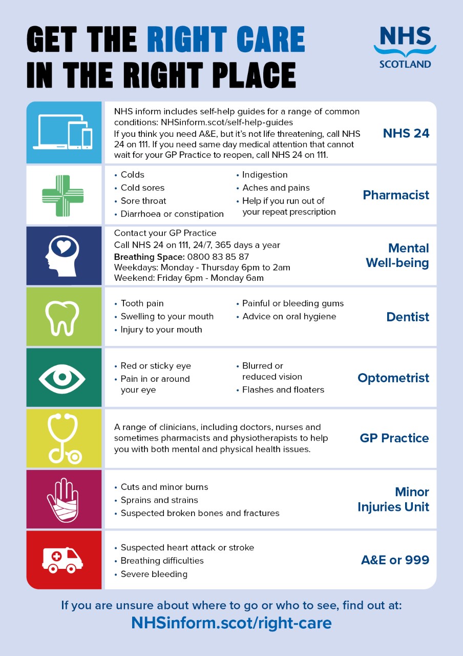 If you have a question about your medicines, please contact your Community Pharmacist, GP practice or another healthcare professional looking after your care.  NHS Highland has a list of healthcare professions to advise you who to turn to When you're ill, know who to turn to.