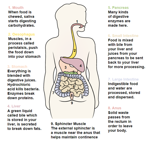 This diagram shows the organs involved in your digestive system. The small intestine and large intestine together make up what we call the "bowel".