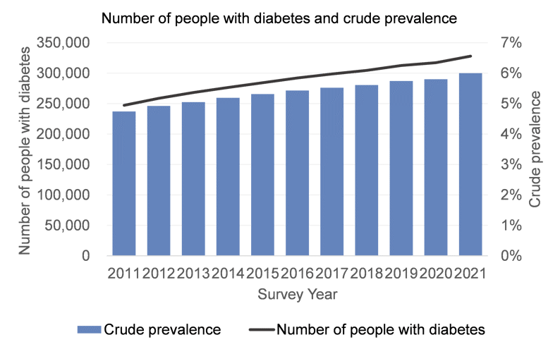At the end of 2020 there were 327,927 people with known diabetes in Scotland recorded on Scottish Care Information-Diabetes (SCI-Diabetes), which represents a crude prevalence of 6.0% of the population of all ages (5,463,300). The full report is available here10