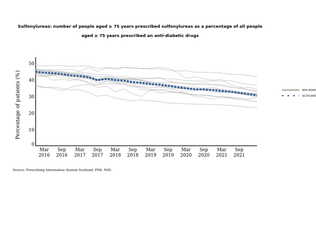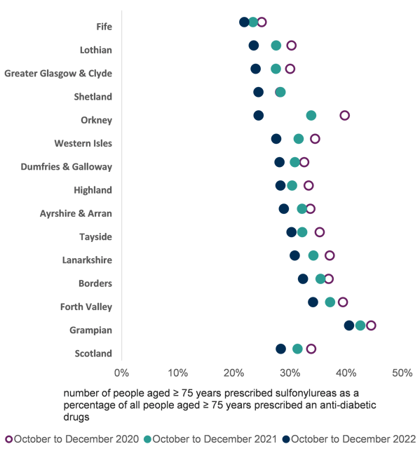Number of people aged 75 years or over prescribed sulfonylureas as a percentage of all people aged 75 years prescribed an anti-diabetic drug