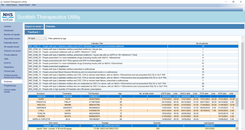 • The diabetes indicators (developed from the NTIs and prescribing guide) highlight the number of people in each indicator. From each indicator title, the names of individuals are shown and their precribing record summarised below.